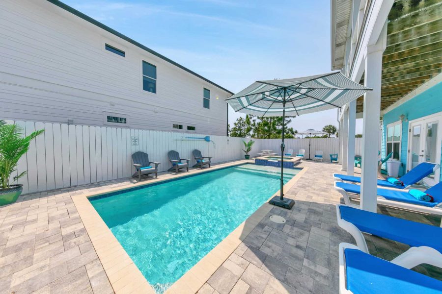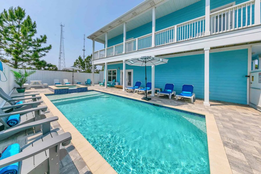 The Blue Escape: One-of-a-kind coastal getaway, custom-designed, Coastal Craftsman Beach House. The Blue Escape features 5 Bedrooms, 2.5 bathrooms, and outdoor living space with a huge private Pool and Hot Tub (pool heated for an additional fee). Spanning two levels and providing over 2900 sq. ft of indoor living space, The Blue Escape is sure to please the most discerning traveler. No detail was overlooked in the design and furnishing of this home. Just a short walk to the beach. Accommodates up to 16 lucky guests.