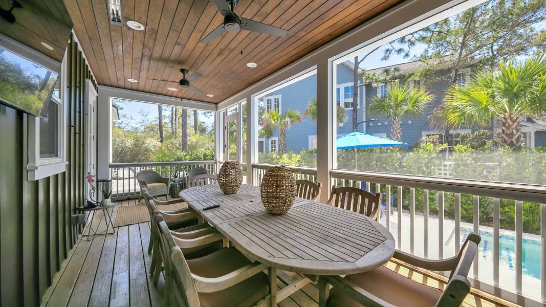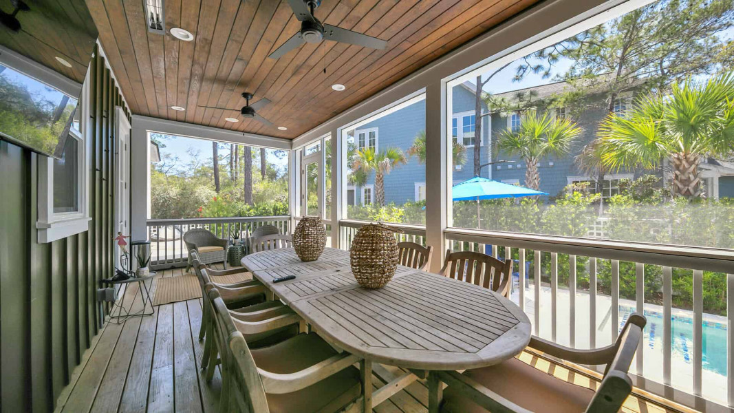 - Two Screened Porches – Living area with porch swing and a separate screened-in oversized Dining Area overlooking the outdoor living space and private pool