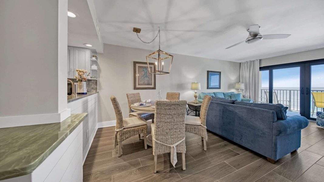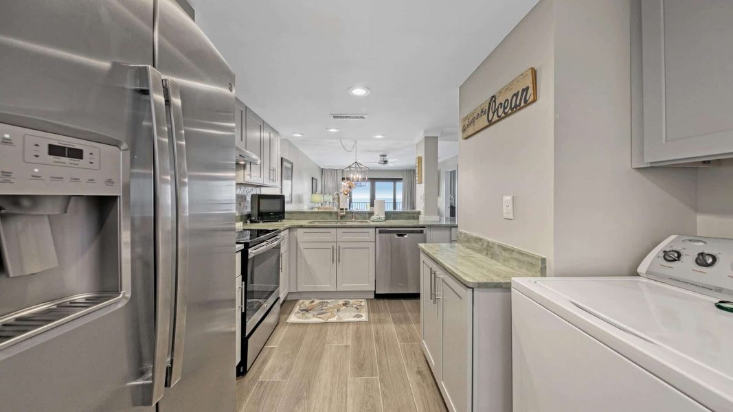 As you enter the property you will be drawn to the beautiful light sandstone floor throughout accented by the light gray cabinets drawing you to the floor-to-ceiling windows providing sweeping views of the Gulf of Mexico. Accommodating up to 6 guests Indian Summer is exquisitely decorated. The large kitchen features granite countertops, top-of-the-line stainless appliances, Keurig Coffee System and all the kitchen equipment and supplies you'll need to prepare the perfect beachside feast. Adjacent to the kitchen you will find a spacious dining area with a dining table accommodating 5 guests while providing views of the Gulf of Mexico. The oversize main living area provides sweeping views of the Gulf of Mexico and stunning shoreline while creating the perfect gathering spot with large flat-screen TV and DVD player.